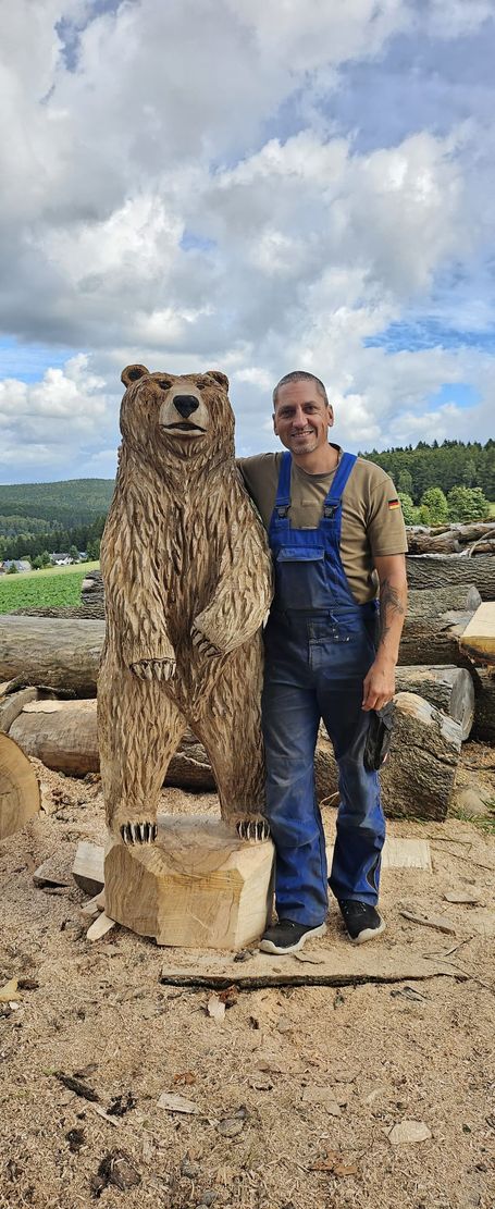 Ich bin Andreas Patzak – Kettensägenkünstler aus Lauter-Bernsbach im Erzgebirge. Was als Leidenschaft begann, ist heute mein Handwerk: Ich fertige individuelle Holzskulpturen aus massivem Holz, direkt nach deinen Wünschen. Kein Import, keine Serienware. Jede Figur entsteht von Hand – von der Rohform bis zum letzten Detail.
